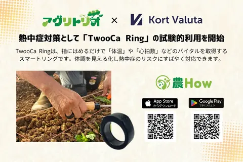 株式会社アグリトリオは、農業分野における熱中症リスクへの新たな対策として、株式会社Kort Valutaが開発・提供するバイタルデータ取得機能付きリング型ウェアラブルデバイス「TwooCa Ring(ツウカリング)」を活用した試験的利用を開始したことをお知らせいたします。